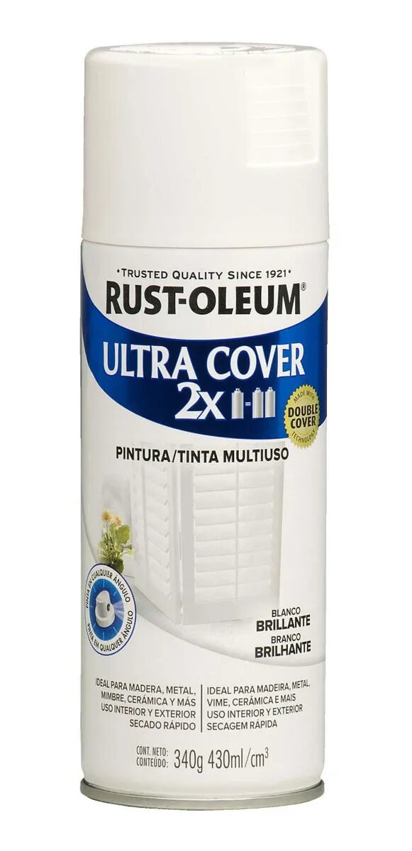 Pintura en aerosol ultra cubritiva para aplicar sobre madera, metal, plástico, mimbre, vidrio, melamina. Con los aerosoles Rust-Oleum® Ultra Cover® 2X puedes renovar, restaurar o reciclar el objeto que imagines, sin importar la forma o material con que esté hecho. Ya sea que estés buscando un color original o un acabado único, encontrarás en Ultra Cover® 2X el mejor aliado para tu proyecto.