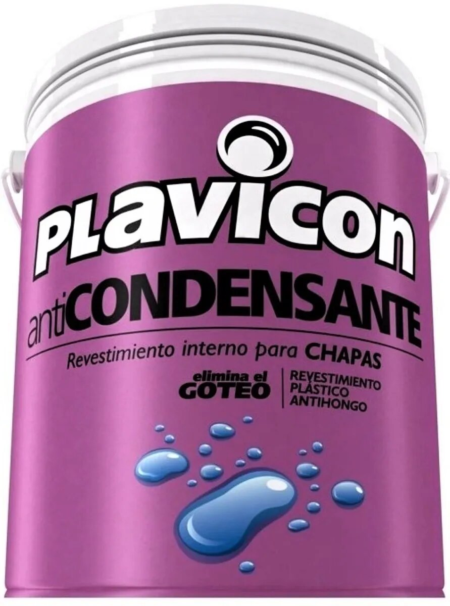 Plavicon Anticondensante es un revestimiento plastico de base acuosa. Con tres manos aplicadas en el lado interno de las chapas , retiene el agua de condensacion el tiempo suficiente para evitar que escurra por la pendiente y termine goteando hacia el interior.